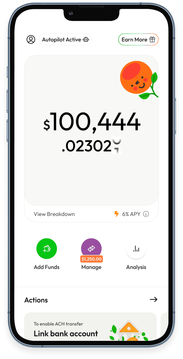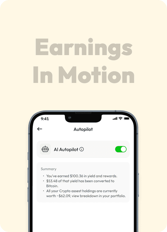 Autopilot is a set-it-and-forget-it feature that automatically uses the yield (interest) you earn from your invested USD deposits to purchase Bitcoin. Instead of letting your yield sit as USD, Autopilot converts it into BTC on your behalf, helping you build a Bitcoin position over time with zero extra effort.
