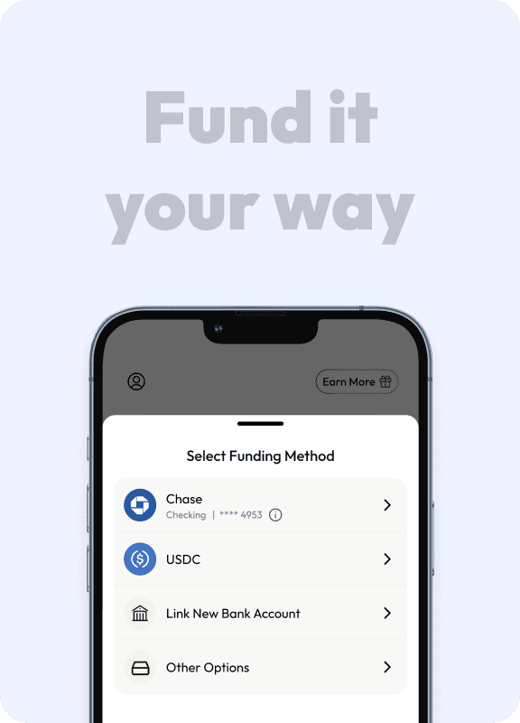 - Bank transfer (ACH) - Debit card - Crypto - transfer stablecoins (USDC) or connect your Coinbase account